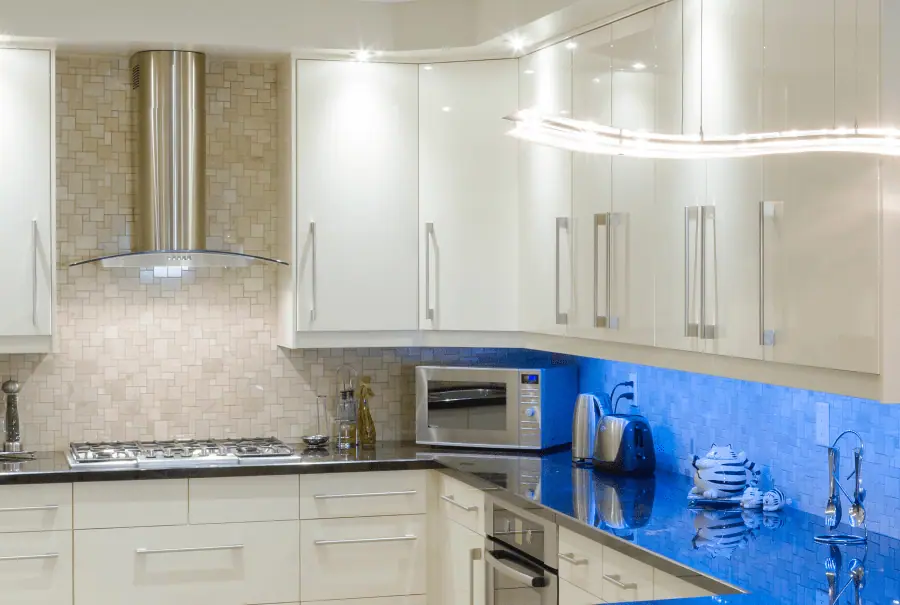 La luz LED ha ganado cada vez más popularidad yestá ampliamente extendida en la actualidad. Frente a la tradicional lámpara de luz cálida en el techo, las cocinas modernas incluyen tiras de luz blanca debajo de los armarios.