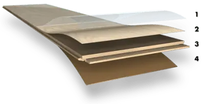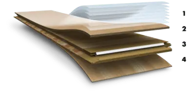 Los suelos laminados están formados por varias capas (láminas) de distintos materiales sintéticos. (1) Una capa superior transparente y resistente al desgaste formada por varias capas de melamina prensadas. Se termina con un relieve que imita la madera para que su textura sea prácticamente idéntica. (2) La impresión de una fotografía de madera real, (3) un panel de fibras de alta densidad duradero, estable y resistente a la humedad y(4) una capa de refuerzo resistente a la humedad que equilibra las lamas.
