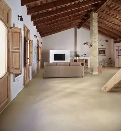 También conocido como suelo de hormigón, ya que hace años se instalaba junto con una base de hormigón de un espesor de entre 5 y 10 cm, haciéndola principalmente apta para naves industriales ya que es muy resistente. Siempre que se realice una correcta instalación, no se agrietará y no se fisurará ya que aguanta una tonelada por centímetro cuadrado de presión.